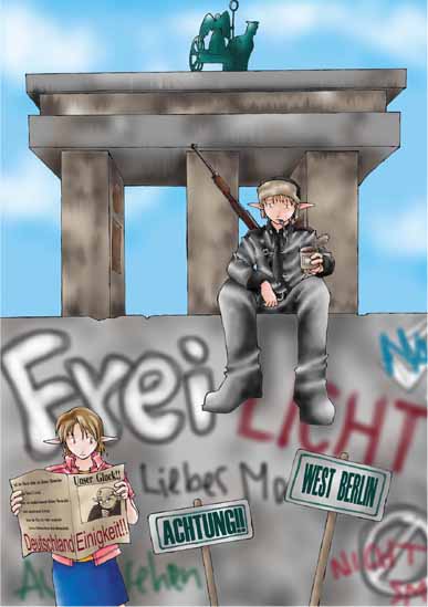ドイツの統一が決定した次の日の 西ベルリンの少女と東ベルリンの兵士。って感じで描いてみたんだけど…。ちなみにエルフなのは俺の趣味です(死)。あー、ドイツ行きたい!!!